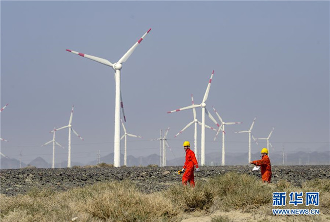 在烏魯木齊近郊的達坂城風力發(fā)電場,兩位工作人員在巡檢風力發(fā)電設(shè)備(9月18日攝)。