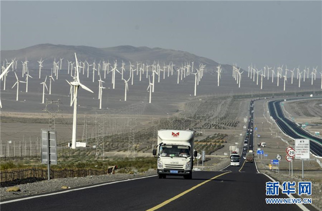 汽車行駛在新疆吐魯番市郊區(qū)風力發(fā)電場一旁的公路上(9月22日攝)。記者趙戈 攝