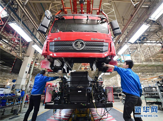 工人在陜重汽汽車總裝配廠車間內(nèi)操作駕駛室吊具,將駕駛室與底盤進(jìn)行連接(3月15日攝)。新華社記者 邵瑞 攝