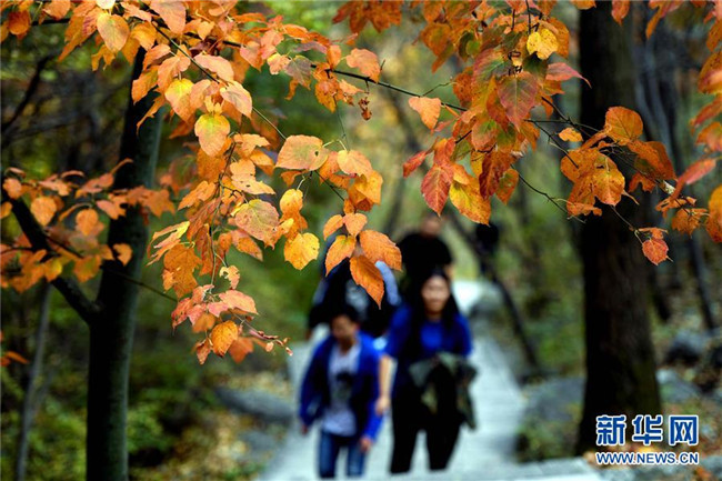 10月6日,游客在位于太行山東麓的靈壽縣五岳寨自然風景區(qū)內觀賞紅葉。新華社發(fā)(陳其保 攝)