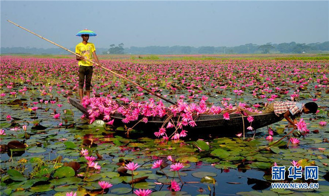 10月7日,在孟加拉國巴里薩爾地區(qū),當(dāng)?shù)鼐用裨诓烧彙?近日,孟加拉國巴里薩爾地區(qū)的睡蓮進(jìn)入盛開時節(jié)。 新華社發(fā)(薩利姆·禮薩 攝)
