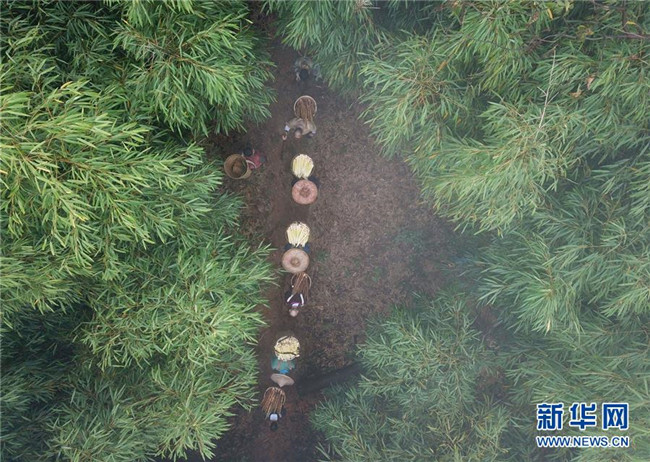 10月14日,在貴州赤水市寶源鄉(xiāng)聯(lián)華村,竹農(nóng)將采挖的竹筍背下山(無人機(jī)拍攝)。金秋時(shí)節(jié),貴州省赤水市寶源、兩河口、丙安等鄉(xiāng)鎮(zhèn)種植的5萬余畝大竹筍迎來收獲季。當(dāng)?shù)刂褶r(nóng)加緊采挖竹筍,進(jìn)行加工后外銷。素有“中國竹子之鄉(xiāng)”的赤水市,現(xiàn)有竹林面積132.8萬畝。竹產(chǎn)業(yè)已經(jīng)成為當(dāng)?shù)孛撠氃鍪盏闹饕乐弧?(王長育 攝)