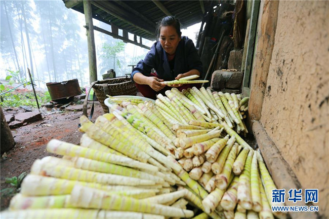 10月14日,在貴州赤水市寶源鄉(xiāng)聯(lián)華村,竹農(nóng)為鮮筍去殼。金秋時(shí)節(jié),貴州省赤水市寶源、兩河口、丙安等鄉(xiāng)鎮(zhèn)種植的5萬余畝大竹筍迎來收獲季。當(dāng)?shù)刂褶r(nóng)加緊采挖竹筍,進(jìn)行加工后外銷。素有“中國竹子之鄉(xiāng)”的赤水市,現(xiàn)有竹林面積132.8萬畝。竹產(chǎn)業(yè)已經(jīng)成為當(dāng)?shù)孛撠氃鍪盏闹饕乐?。(王長育 攝)