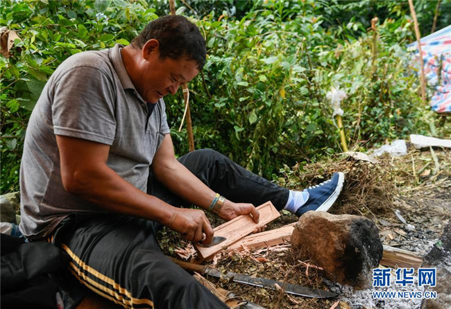 10月22日,在西藏林芝市墨脫縣墨脫鎮(zhèn)米日村臨時救災(zāi)安置點,一名男子在制作刀鞘。 受雅魯藏布江堰塞湖影響的群眾被轉(zhuǎn)移到臨時救災(zāi)安置點,這里秩序井然,群眾基本生活得到保障。10月17日,雅魯藏布江米林縣加拉村附近發(fā)生山體滑坡,堵塞河道,形成堰塞湖。 新華社記者 劉東君 攝
