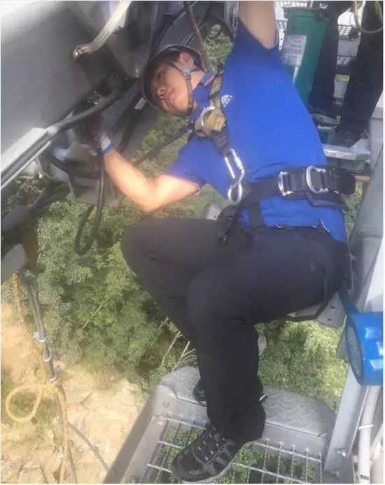 索道維護(hù)工每隔2小時(shí)坐檢修車(chē)沿索道線巡查一次。檢修車(chē)四面敞開(kāi)、像個(gè)吊籃一樣。坐在全封閉的索艙里,尚有游客嚇得大喊大叫,站在四面敞開(kāi)的檢修車(chē)上的感覺(jué)可想而知。