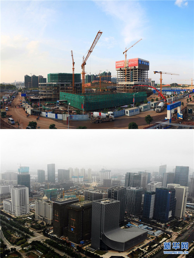拼版照片。上圖為建設(shè)中的廣西南寧市五象新區(qū)(2016年5月2日,新華社發(fā) 任鵬飛 攝);下圖為無人機(jī)航拍五象新區(qū)的廣西文化藝術(shù)中心(2018年10月22日,新華網(wǎng) 章佳禮 攝)