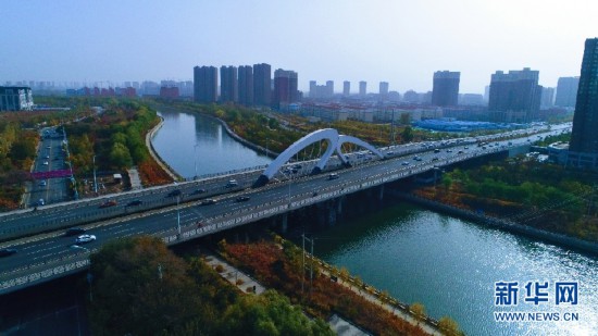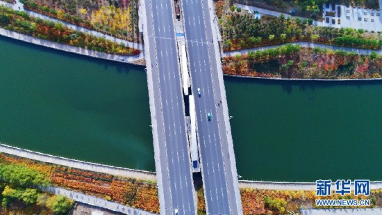 車輛從呼和浩特環(huán)城水系的一座橋上駛過。新華網發(fā) (樂炎 攝)