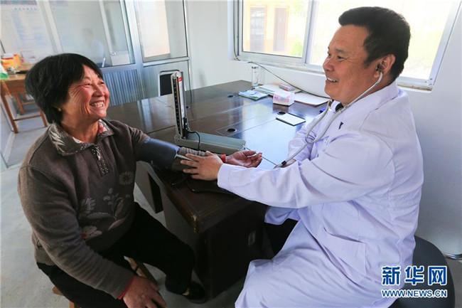 在山東蒙陰縣云夢湖生態(tài)區(qū)東汶社區(qū)的農(nóng)村幸福院養(yǎng)老院的醫(yī)務(wù)室,醫(yī)生為老人測量血壓(10月11日攝)。2016年,東汶社區(qū)將原來的村兩委大院擴建為農(nóng)村幸福院養(yǎng)老院,委派專人負(fù)責(zé)老人們的一日三餐。同時按照“子女交納、集體補助、社會捐贈、財政獎勵”的模式設(shè)立孝心養(yǎng)老基金,每月定時發(fā)給貧困老人。新華社記者 王南 攝