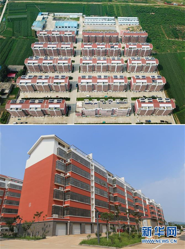拼版照片(8月22日攝):上圖為無人機拍攝的山東費縣朱田鎮(zhèn)崔家溝社區(qū);下圖為山東省臨沂市費縣朱田鎮(zhèn)崔家溝社區(qū)的居民樓。崔家溝村是遠(yuǎn)近聞名的“光棍村”“貧困村中的貧困村”。2016年3月,崔家溝村在中央異地搬遷政策的扶持下,實現(xiàn)了整體搬遷,1600多口人搬到了鎮(zhèn)駐地。從此,昔日的“光棍村”,一躍進入朱田鎮(zhèn)富裕村行列。新華社記者 王南 攝