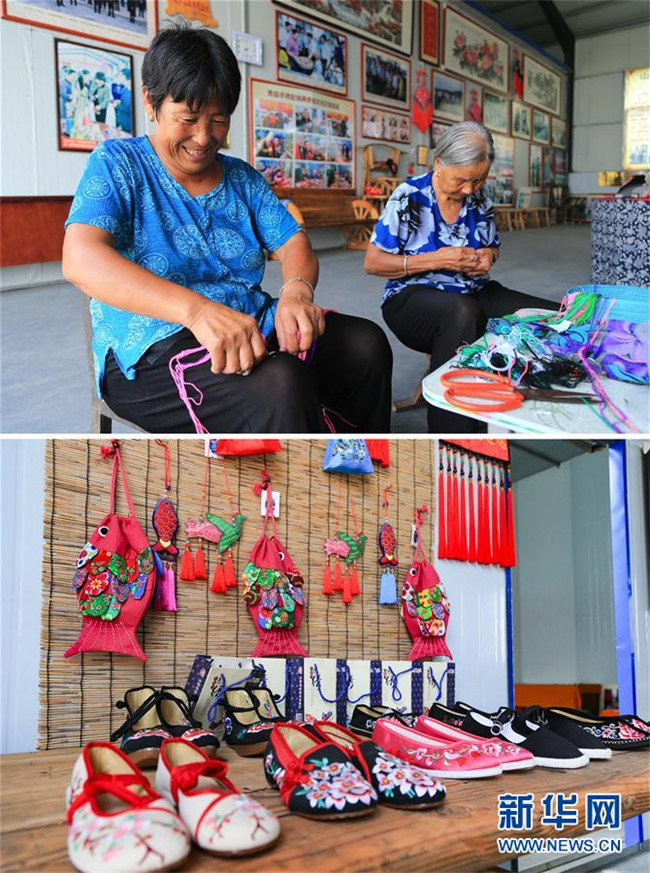 拼版照片(8月22日攝):上圖在山東費縣朱田鎮(zhèn)崔家溝社區(qū)的居家靈活就業(yè)培訓(xùn)中心,當(dāng)?shù)卮迕裨诳p制手工飾品;下圖當(dāng)?shù)卮迕窨p制的手工飾品和布鞋(8月22日攝)。崔家溝村是遠(yuǎn)近聞名的“光棍村”“貧困村中的貧困村”。2016年3月,崔家溝村在中央異地搬遷政策的扶持下,實現(xiàn)了整體搬遷,1600多口人搬到了鎮(zhèn)駐地。從此,昔日的“光棍村”,一躍進入朱田鎮(zhèn)富裕村行列。新華社記者 王南 攝