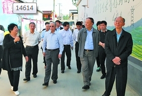 全國黨建研究會(huì)會(huì)長李景田(前排左四)、副會(huì)長杜德?。ㄇ芭抛蠖┑纫恍性谏轿魇x城市調(diào)研基層黨建。焦建宇攝/光明圖片