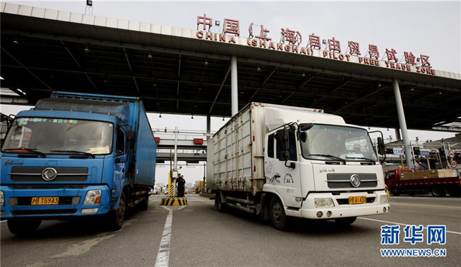完成無(wú)紙化通關(guān)手續(xù)的卡車駛出位于上海外高橋的自貿(mào)區(qū)車輛出入口(2017年1月10日攝)。新華社記者方喆攝