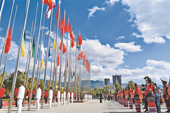 圖為省第十一屆少數(shù)民族傳統(tǒng)體育運(yùn)動(dòng)會(huì)代表團(tuán)升旗儀式在臨滄市體育運(yùn)動(dòng)中心體育場舉行。夏方海 攝