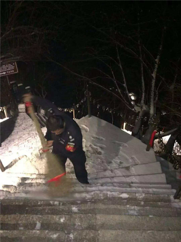 2019年元月4日,在小寒節(jié)氣到來(lái)之前,一場(chǎng)應(yīng)景的小雪降落在華山,華山主峰區(qū)的工作人員第一時(shí)間清掃積雪,為游客的安全保駕護(hù)航。