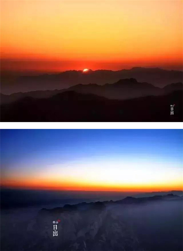 是時,但見夜幕自東方悄然隱退,晨曦初露,漸漸霞光瑰麗,云源奔涌。瞬間,一輪火球噴薄而出,繼而光芒四射,氣象萬千,整個世界大放光明,游人身心為之一振。待云霧散盡,蒼松翠柏,則更加清麗悅目,美妙神奇。故而,游名山者必登華山,登華山者必觀日。華山日出亦被列為華山自然風光中的重要景觀之一。