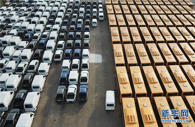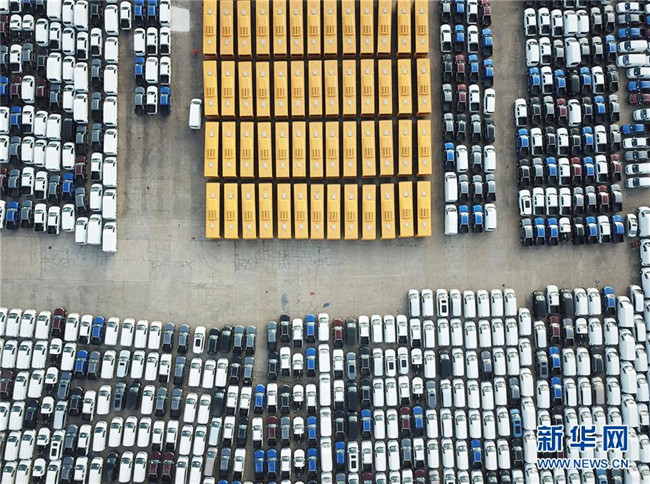 大批國產車輛在江蘇連云港港口碼頭等待裝船(2018年12月31日無人機拍攝)。新華社發(fā)(耿玉和 攝)
