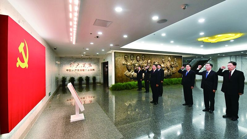 2017年10月31日,中共中央總書記、國家主席、中央軍委主席習(xí)近平帶領(lǐng)中共中央政治局常委李克強、栗戰(zhàn)書、汪洋、王滬寧、趙樂際、韓正,瞻仰上海中共一大會址和浙江嘉興南湖紅船。這是31日上午,在上海中共一大會址紀(jì)念館,習(xí)近平帶領(lǐng)其他中共中央政治局常委同志一起重溫入黨誓詞。 新華社記者 李濤/攝