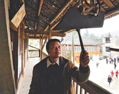 代課教師潘平忠在孖堯教學點教學樓二樓敲簡易制作的上課鈴。