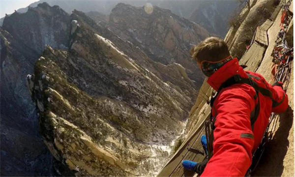 我獨(dú)自一人出發(fā),一段垂直的石隙,鐵條插在巖石之中,道路向下延伸,風(fēng)刮得很大,我雙手麻木,死死地抓住鐵鏈,慢慢向下挪動,腳下是一千米深的峽谷,這是一個恐懼與光榮交織的時(shí)刻。我走在棧道上,左右上下地欣賞著風(fēng)景,周圍大山巨大而孤獨(dú),我感覺自己就像是一個塵埃,真的太渺小了。冰屑落到頭頂上,幸虧不是石塊。我聽到一群中國游客笑著從石隙中下來,我停下來照了幾張相,要回去必須原路返回,這同樣不容易,我很感謝地歸還了手套,繼續(xù)向其他山峰攀登。由于有安全保護(hù)措施,因此我不認(rèn)為華山是“世界上最危險(xiǎn)的道路”。