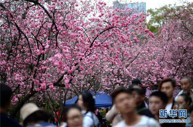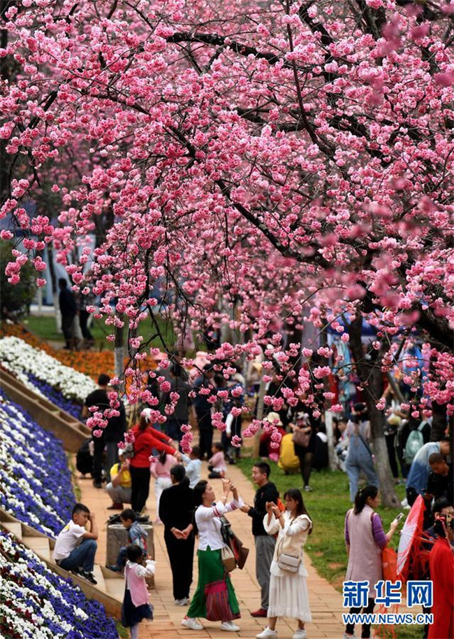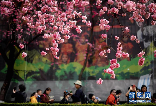 游人在昆明圓通山公園觀賞盛開的櫻花(3月16日攝)。新華社記者 秦晴 攝