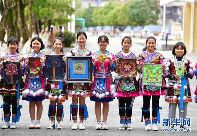 在融水苗族自治縣民族中學(xué),女童班的學(xué)生在展示刺繡作品(3月22日攝)。  新華社記者 黃孝邦 攝