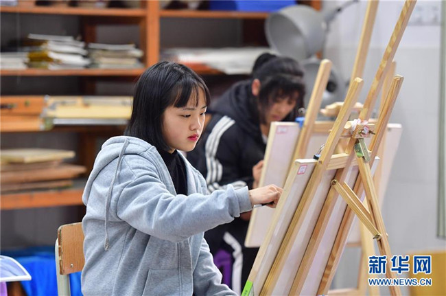 在融水苗族自治縣桿洞中學(xué),學(xué)生在繪畫(huà)室里上課(3月13日攝)。  新華社記者 黃孝邦 攝