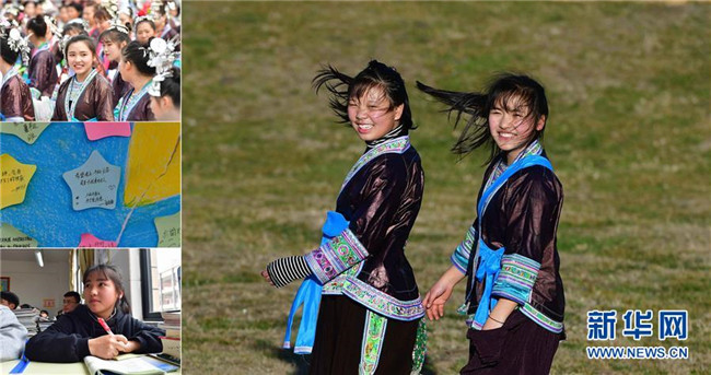 這是一張拼版照片:右圖為韋迎春(右)和同學(xué)在一起(2月6日攝);左上圖為韋迎春(中)在家鄉(xiāng)的“打同年”活動(dòng)中(2月7日攝);左中圖為韋迎春在小卡紙上寫(xiě)下的夢(mèng)想(3月22日攝);左下圖為韋迎春在課堂上聽(tīng)課(3月22日攝)。韋迎春來(lái)自融水苗族自治縣桿洞鄉(xiāng)堯告村,目前在融水民族高中讀高一。 新華社記者 黃孝邦 攝