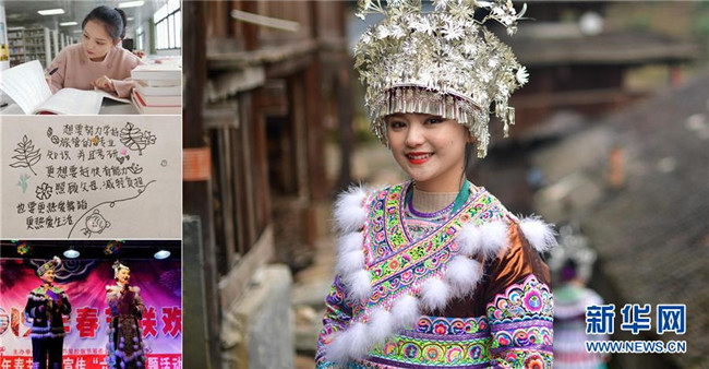 這是一張拼版照片:右圖為楊琳詩(shī)瑤(2月16日新華社記者黃孝邦攝);左上圖為楊琳詩(shī)瑤在學(xué)校圖書(shū)館里學(xué)習(xí)(3月23日攝,楊琳詩(shī)瑤供圖);左中圖為楊琳詩(shī)瑤在紙上寫(xiě)下的夢(mèng)想(3月23日攝,楊琳詩(shī)瑤供圖);左下圖為楊琳詩(shī)瑤(右)在家鄉(xiāng)主持苗寨的春節(jié)聯(lián)歡晚會(huì)(2月10日新華社記者黃孝邦攝)。楊琳詩(shī)瑤是融水苗族自治縣桿洞鄉(xiāng)桿洞村的苗族姑娘,去年以?xún)?yōu)異成績(jī)考上廣西民族大學(xué)。  新華社發(fā)