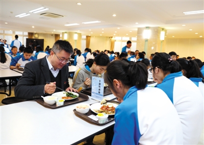 北京市陳經(jīng)綸中學(xué)高中校區(qū)的食堂開設(shè)了七八個(gè)窗口,為學(xué)生配備了不同套餐,每日的菜單都在食堂內(nèi)公示。校長(zhǎng)牟成梅幾乎每天中午都在食堂用餐,牟成梅回憶,從她來(lái)到學(xué)校時(shí)校內(nèi)就有陪餐制度,這一傳統(tǒng)至少延續(xù)了兩年多。