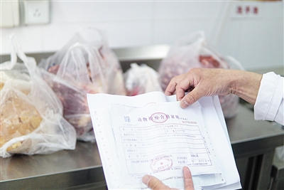 安樂(lè)幼兒園食堂管理員查驗(yàn)動(dòng)物檢疫合格證明等。新京報(bào)記者 馮琪 攝