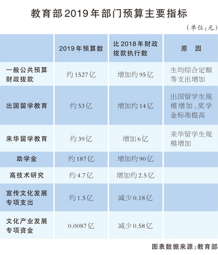 關(guān)于資金來源,教育部2019年部門預(yù)算顯示,2019年一般公共預(yù)算財政撥款約為1527億元,比上年執(zhí)行數(shù)增加約95億元。其主要原因為生均綜合定額、出國留學(xué)經(jīng)費以及學(xué)生資助工作專項等支出增加。