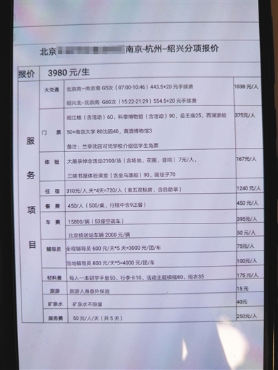 海淀區(qū)某中學(xué)則向家長公開了收費明細(xì)。在家長王先生提供的游學(xué)清單上,記者看到5天的研學(xué)旅行費用為3980元,游覽地點包括南京大屠殺遇難同胞紀(jì)念館、西湖和魯迅紀(jì)念館等。行程中還設(shè)置了眾多教育內(nèi)容,比如參加南京大學(xué)講座、著漢服行謝師禮、探究杭州西湖的光學(xué)現(xiàn)象等。