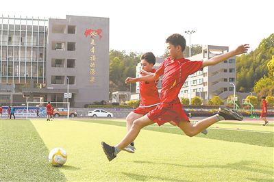 日前,湖北省武漢市英山縣思源實驗學校綠茵操場上,學生正在進行攔截搶球訓練。為了培養(yǎng)學生的足球興趣,該校開展了“陽光足球大課間”體育活動,倡導全體師生充分享受課間足球運動。(單藝偉/攝)