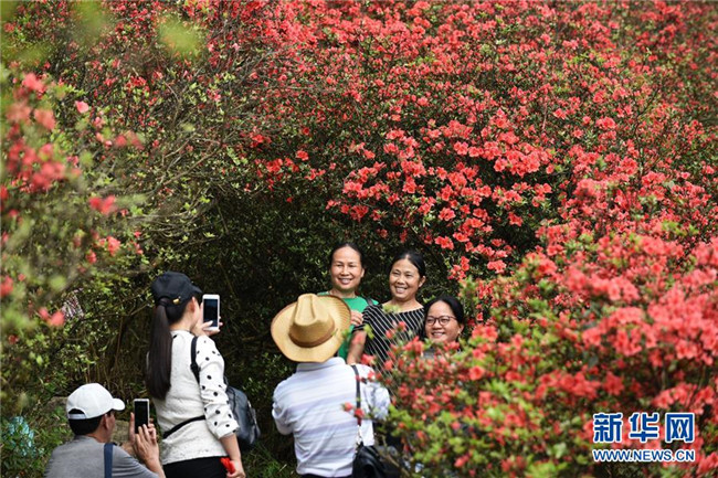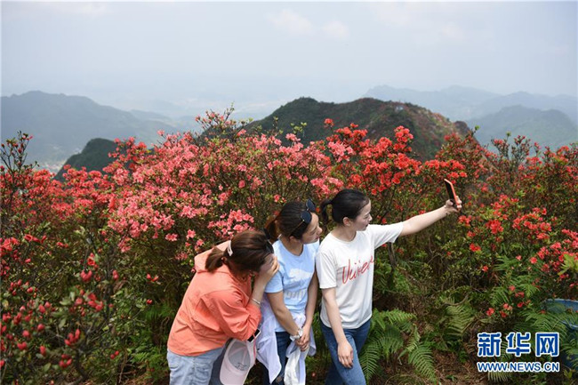 4月25日,游客在貴州省丹寨縣龍泉山景區(qū)的映山紅花間留影。暮春時(shí)節(jié),位于貴州省黔東南苗族侗族自治州丹寨縣龍泉山景區(qū)的映山紅陸續(xù)開放,紅遍山嶺,吸引眾多游客前來賞花觀光。 新華社記者 楊文斌 攝