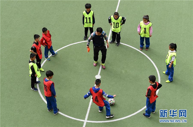 陜西省延安市楊家?guī)X福州希望小學(xué)足球社團(tuán)的學(xué)生在進(jìn)行足球訓(xùn)練(4月24日攝)。