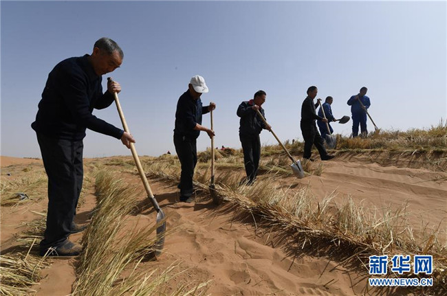 在甘肅省古浪縣境內的黑崗沙風沙口,八步沙第二代治沙人用稻草壓沙(2019年3月26日攝)。新華社記者 范培珅 攝