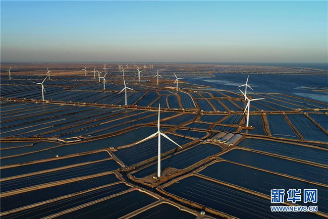 這是河北省唐山市樂亭縣姜各莊鎮(zhèn)海邊養(yǎng)殖區(qū)內的風電場(2018年11月10日無人機拍攝)。新華社記者 楊世堯 攝