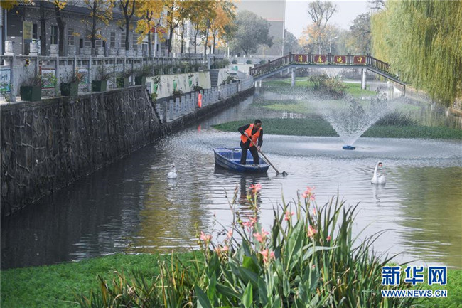 浙江省長興縣虹星橋鎮(zhèn)港口村東港內,河長孫根法在打撈水面漂浮物(2018年11月28日攝)。 新華社記者 徐昱 攝