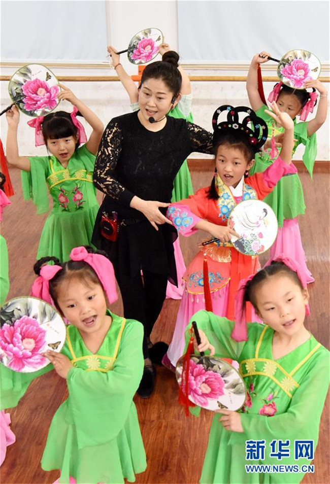 4月26日,在安徽銅陵市義安區(qū)實驗小學,孩子們在戲曲進校園志愿者的指導下,練習黃梅戲。