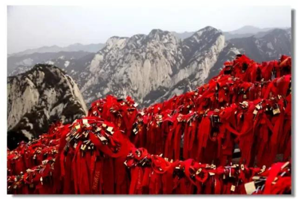 華山是一座愛情的殿堂,華山上的愛情故事悲烈、凄美而感人。我們曾經(jīng)為世界上許許多多的愛情故事所感動。其實,發(fā)生在華山上的愛情故事一樣讓人的心情無法平靜。眾所周知的神話傳說《寶蓮燈》中,三圣母為了愛情,被二郎神巨石壓在華山頂上;弄玉為了愛情,逃離安逸的生活,與蕭史雙雙來到華山,琴瑟合鳴;漢臣王咸不畏艱險,到華山尋找賢妻南陽公主等等這些愛情故事,感天動地,流傳不衰,不知讓多少人為之贊嘆。也許是讓華山上這些動人的愛情故事所感染,不知從什么時候開始,在代表著堅實連接的一串串鐵鏈上,游人掛上了閃閃的金鎖,把矢志不渝的愛情鎖在華山上,在華山的見證下,祝愿自己的愛情如同華山一樣永遠(yuǎn)不會改變。