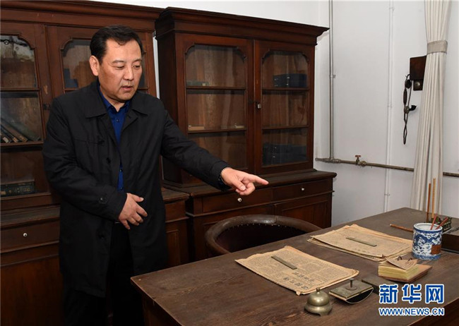 北京新文化運(yùn)動(dòng)紀(jì)念館副館長李金光在北大紅樓中介紹當(dāng)年圖書館主任李大釗的辦公室(4月9日攝)。新華社發(fā)(任超 攝)