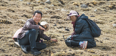 | 崔久鄉(xiāng)的拉姆(右一)等牧民,在剛?cè)谘┎痪玫纳狡虏莸厣蠈ふ蚁x草。 |