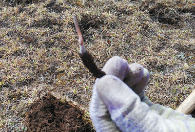 | 發(fā)現(xiàn)蟲草后,拉姆用鋤頭小心地翻起一塊草皮,拔出了一根蟲草。 |