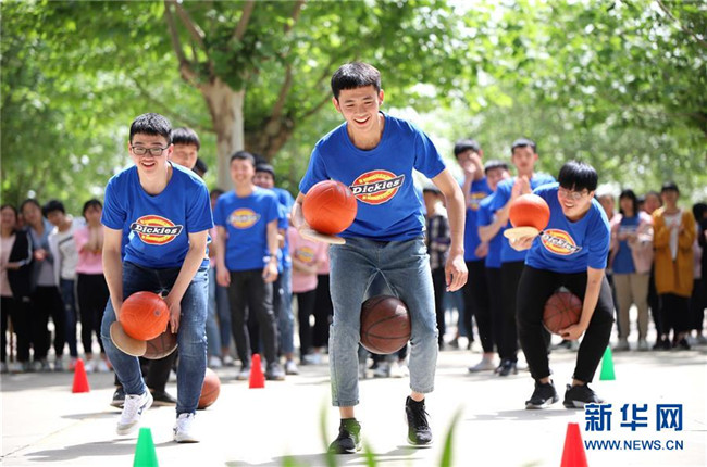 5月14日,河北省石家莊新樂市第二中學(xué)高三學(xué)生在進行趣味運球比賽。 新華社發(fā)(賈敏杰 攝)