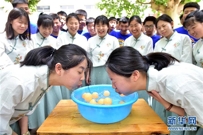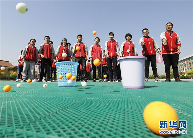 5月14日,河北省唐山遵化市堡子店中學(xué)高三學(xué)生在進行投乒乓球游戲。 新華社發(fā)(劉滿倉 攝)
