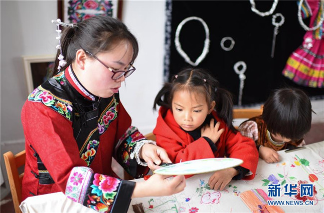 5月14日,在銅仁市松桃苗族自治縣盤信鎮(zhèn)后寨村的山村幼兒園,教師在輔導學生學習苗繡。新華社發(fā)(龍元彬 攝)
