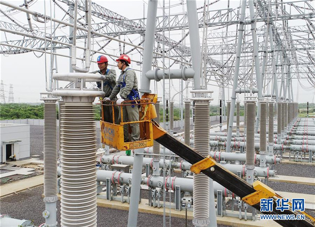 5月13日,在武漢市東湖高新區(qū)龍泉街,國網(wǎng)湖北送變電工程有限公司施工人員在檢查鳳凰山變電站設(shè)備。新華社記者 肖藝九 攝