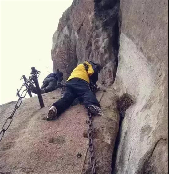 具有700多年歷史的長空棧道,在華山南峰東側(cè)山腰的萬仞絕壁上。鑿出來的幾個踏腳之處,鑲嵌石釘搭木椽搭建了一個百余米懸空的棧道,讓人望而卻步。如果你有恐高癥,僅僅看一眼都會讓你心驚膽戰(zhàn)。2013年,著名旅游網(wǎng)站“Smarter Travel”盤點(diǎn)全球最恐怖懸崖步道,將華山長空棧道列為全球十大最恐怖的懸崖步道之一。