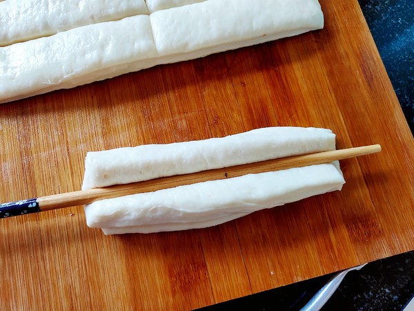 5.輕拍面團(tuán)按扁,搟成長(zhǎng)薄餅狀。