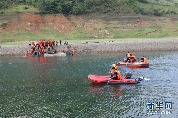 5月24日,救援人員駕駛沖鋒舟在河上搜尋打撈。新華社發(fā)(丁居聰 攝)